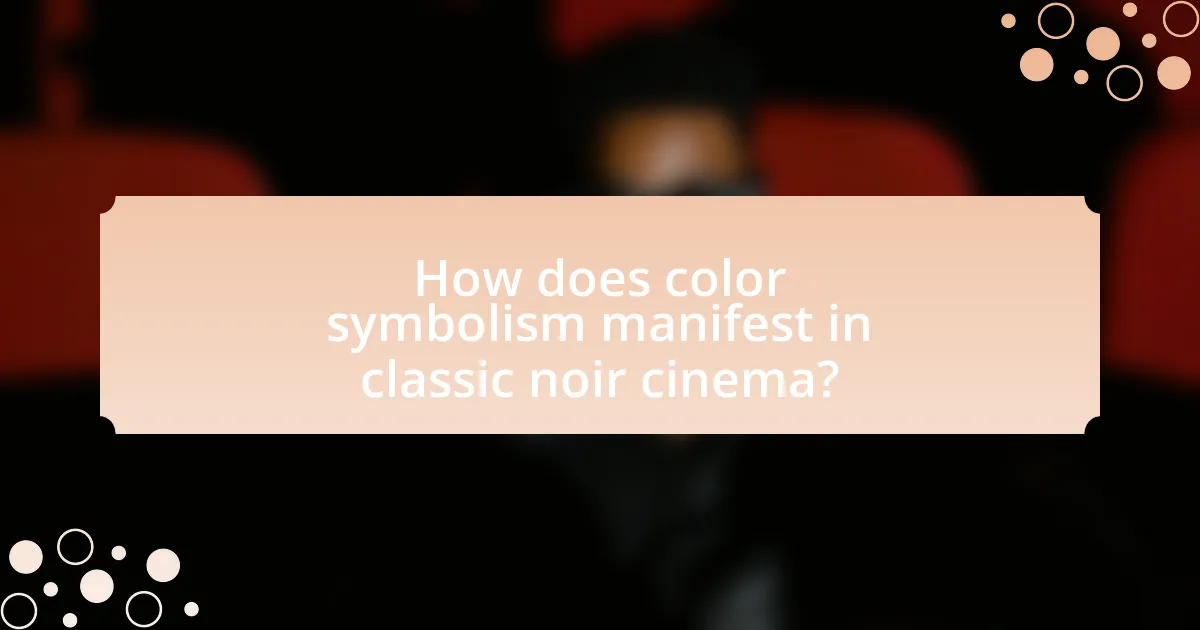 Color symbolism in classic noir cinema primarily manifests through the use of stark contrasts, particularly between light and dark, to convey themes of moral ambiguity and psychological tension. For instance, the frequent use of shadows and low-key lighting creates a sense of foreboding and highlights the inner turmoil of characters, as seen in films like “Double Indemnity” and “The Maltese Falcon.” Additionally, colors such as red often symbolize danger or passion, while blue can represent melancholy or betrayal, reinforcing the emotional landscape of the narrative. This deliberate use of color not only enhances the visual aesthetic but also deepens the viewer’s understanding of character motivations and thematic elements, as evidenced by the critical analysis of these films in scholarly works like “Film Noir: A Critical Introduction” by Michael Walker.